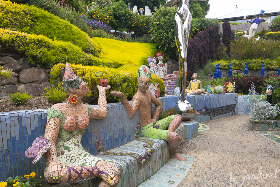 This is a garden where you could write a new story for every scene. Here we have Eve tempting Adam perhaps – but he has a watermelon on his head…and yet the snake is writhing between them.