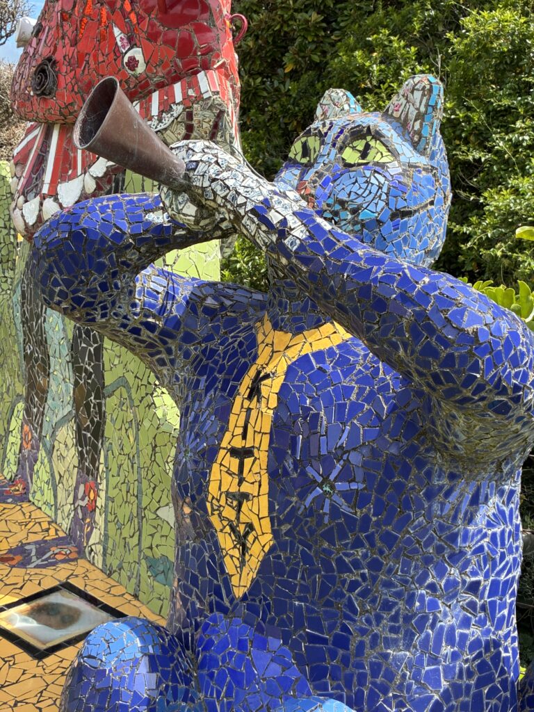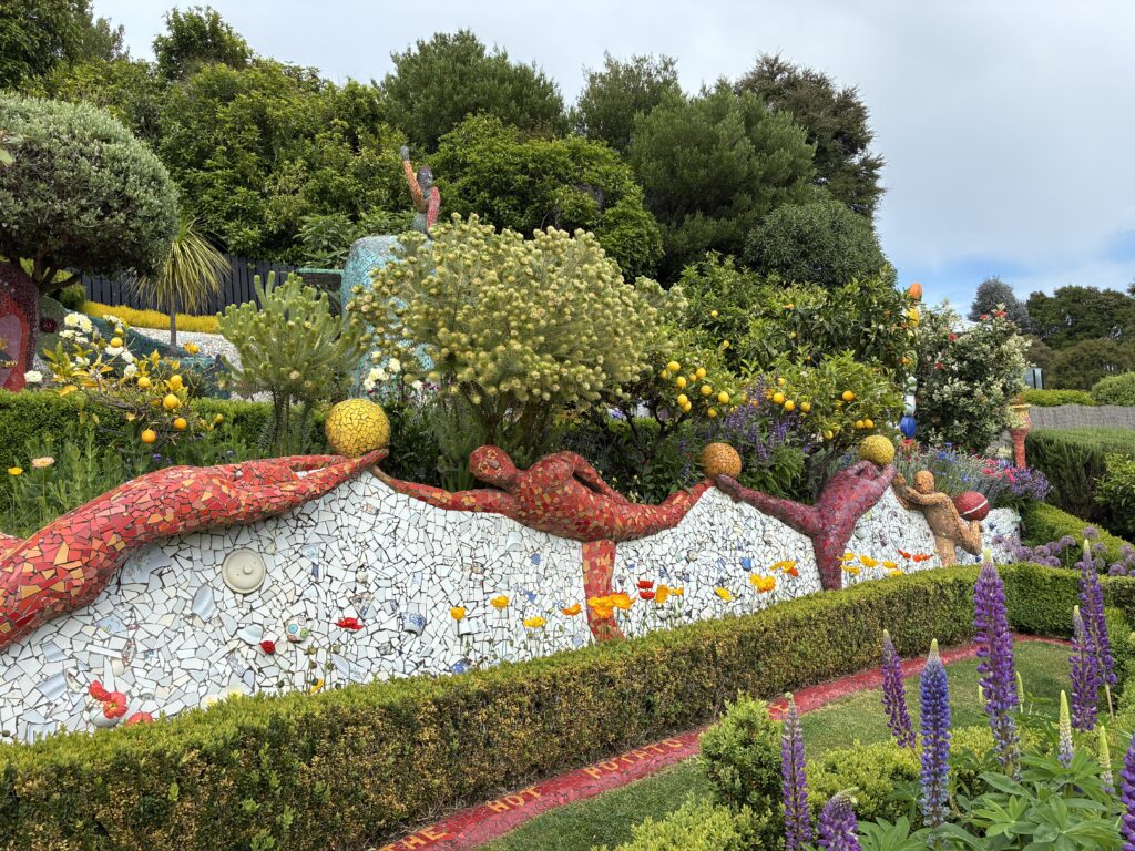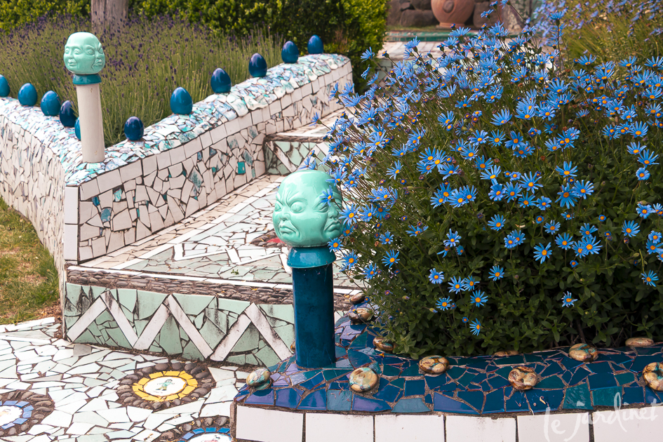 Mosaic figures juggle balls giving form to an undulating wall, but notice the repetition of yellow and red in the poppies growing at the base of that wall and the yellow flowers above. Both serve to frame and enhance the scene as does the carefully clipped low hedge
