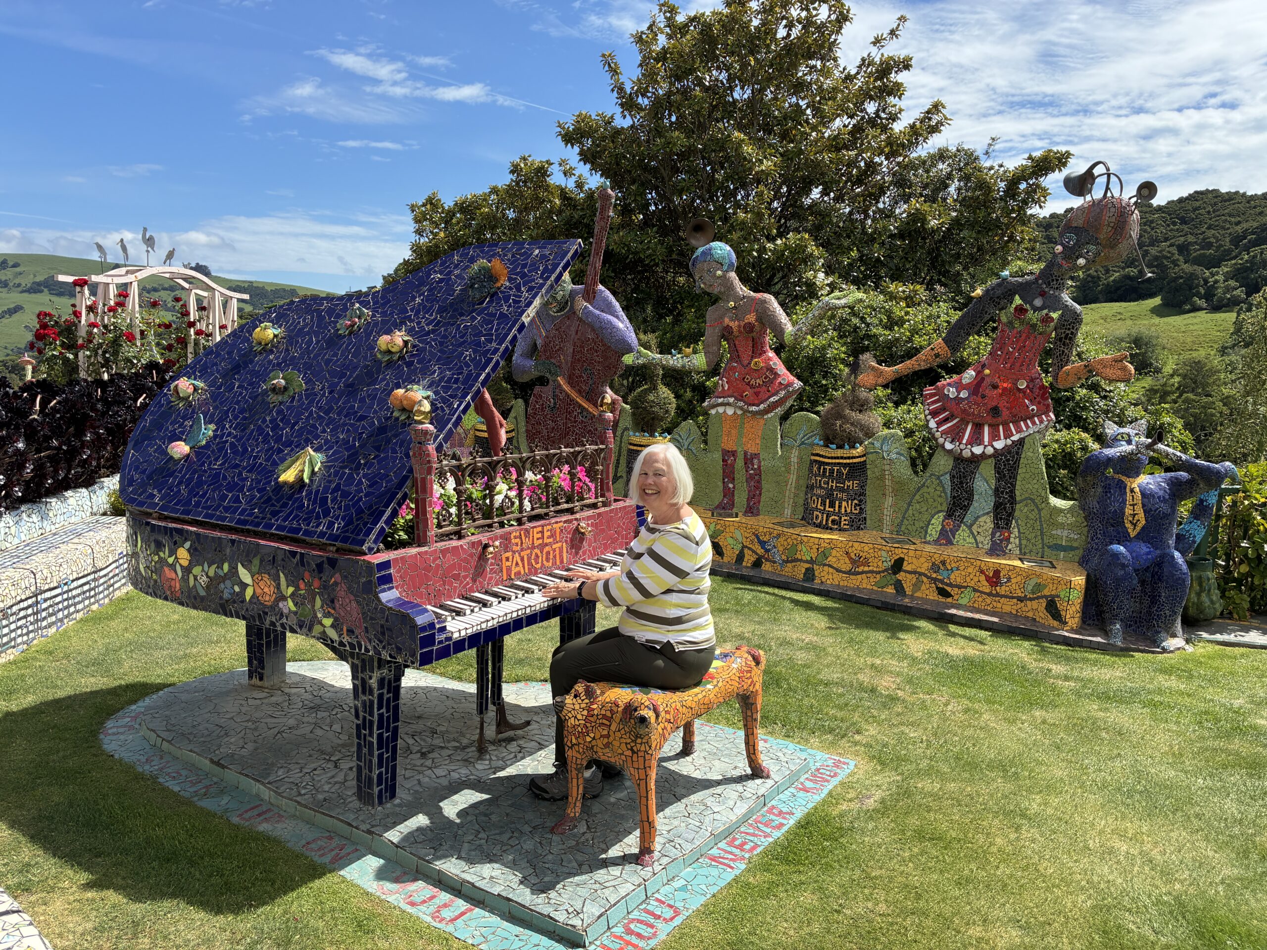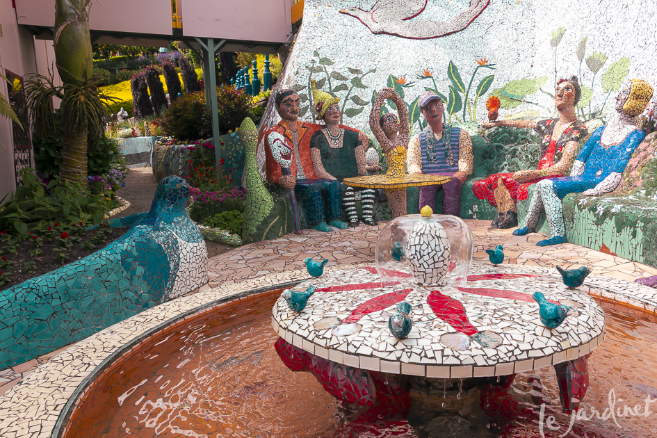 This scene anchored the main garden and was truly outstanding. The details on the piano, the bench, the band and even the wall which featured a mosaic musical stave – incredible. And our lovely Kathy was the perfect guest to complete the scene.