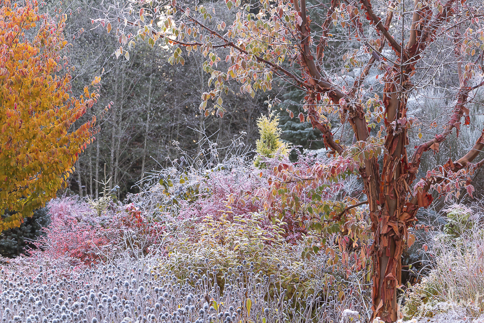 The peeling bark of a paperbark maple (Acer griseum) acts as a textural focal point within a frost-etched tapestry of seed heads and autumnal foliage.