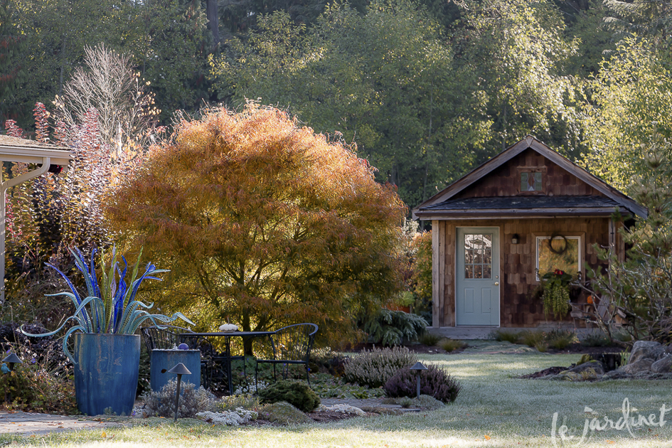 While the Koto-no-ito Japanese maple is clearly the fall star in this scene, the counterpoint of blue containers and glass art makes the vignette all the more memorable
