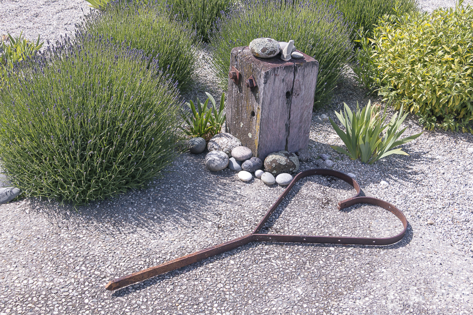 At the base of the 'dry' tear drop is a rusted metal sculpture that again suggests history to this 18-year-young garden