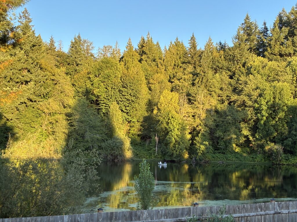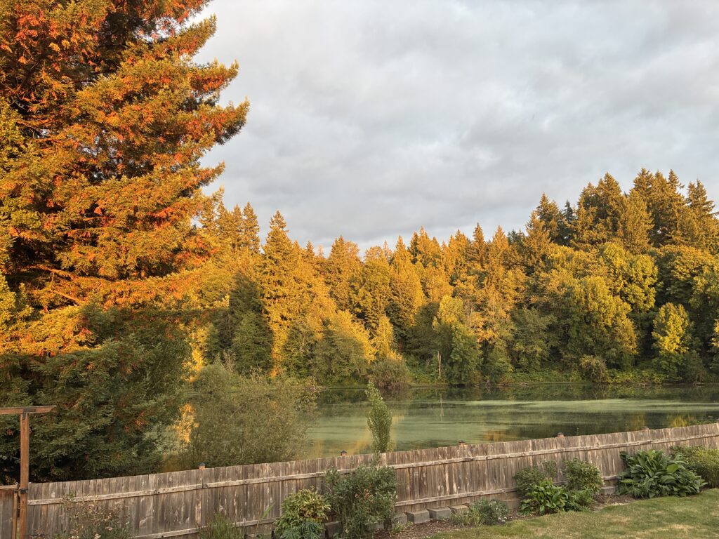 My regular readers will know that we moved house last July, leaving our 5 acres of 16 years for a much smaller garden closer to town and family. We are still busy with house renovations but of course my mind is working overtime with ideas for the landscape. Our back garden overlooks a small peaceful lake backed by a forested hillside. We love to sit on our deck and watch the play of light; sparkles on the water, sunrise glow from behind the trees, the evening alpenglow that sets the trees on fire, autumnal shades as the big leaf maples contrast with towering evergreens. Jo's connection to her surroundings gave me the idea to mimic the colors of the lake and forest (green, gold, orange-red and white (for the sparkles)) in our plant palette and to keep the plantings mostly low mounds with just some see-through vertical elements here and there.